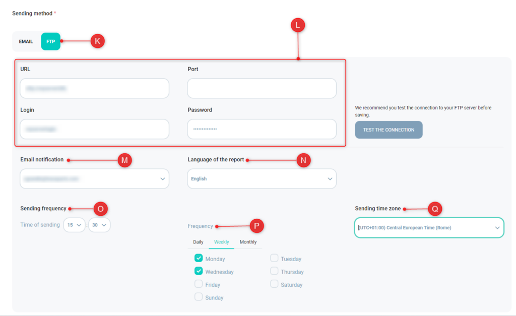 Wie beim Senden per E-Mail muss er dann die Sprache des Berichts (N), die Häufigkeit (O) und Wiederholung (P) des Versands sowie die Zeitzone für den Versand (Q) einstellen.