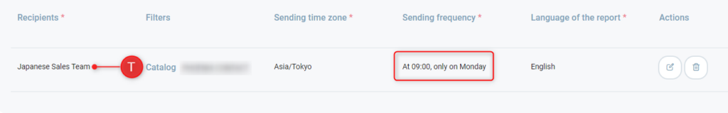 • In der dritten Zeile (T) fülle ich die E-Mail-Adresse des Vertriebsteams in Tokio aus, stelle die Zeitzone entsprechend ihrem Standort ein (UTC+09:00) Japan Standard Time (Tokio) und gebe abschließend eine wöchentliche Versandfrequenz am Montag um 09:00 Uhr an.