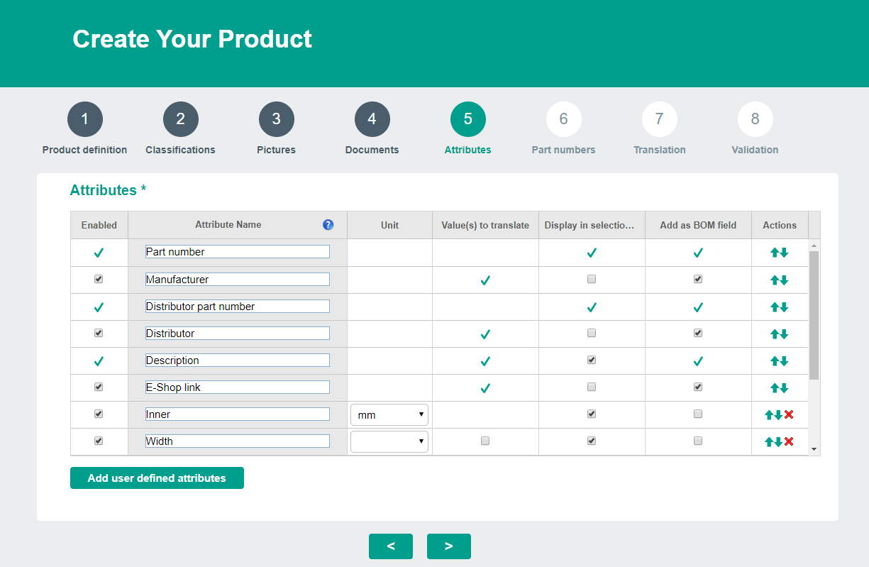 Attributes Estimated reading: 2 minutes Step 5 - Define attributes / characteristics Once the table header has been configured, the next step is to complete the rows. The list of fields in this table may vary depending on the chosen classification (in Step 2). Click on the image to enlarge it. To add a new product attribute, click the “Add user defined attributes” button, below the table, or click inside an empty cell to add a row automatically. You can decide whether or not to display an attribute by selecting or deselecting the box in the “Display” column. Some specific attributes are obligatory and cannot be deselected. It is good practice to add a unit of measurement for all attributes that define a physical quantity. When the attribute is a text, check “Value(s) to translate” checkbox if it needs to be translated in the language(s) available for the product, To move a row, click the “up” and “down” arrows in the “Actions” column or relocate it using your mouse. To delete a row, click the red cross in the “Actions” column. Can I modify the names of the attributes defined by default ? You can modify the labels of the default attributes in order to adapt them to your own vocabulary while keeping the original meaning of the attribute. For example, you might want to rename the attribute “part number” to “article number” if that is how you refer to your product when dealing with your customers. Documents > Attributes > Part numbers
