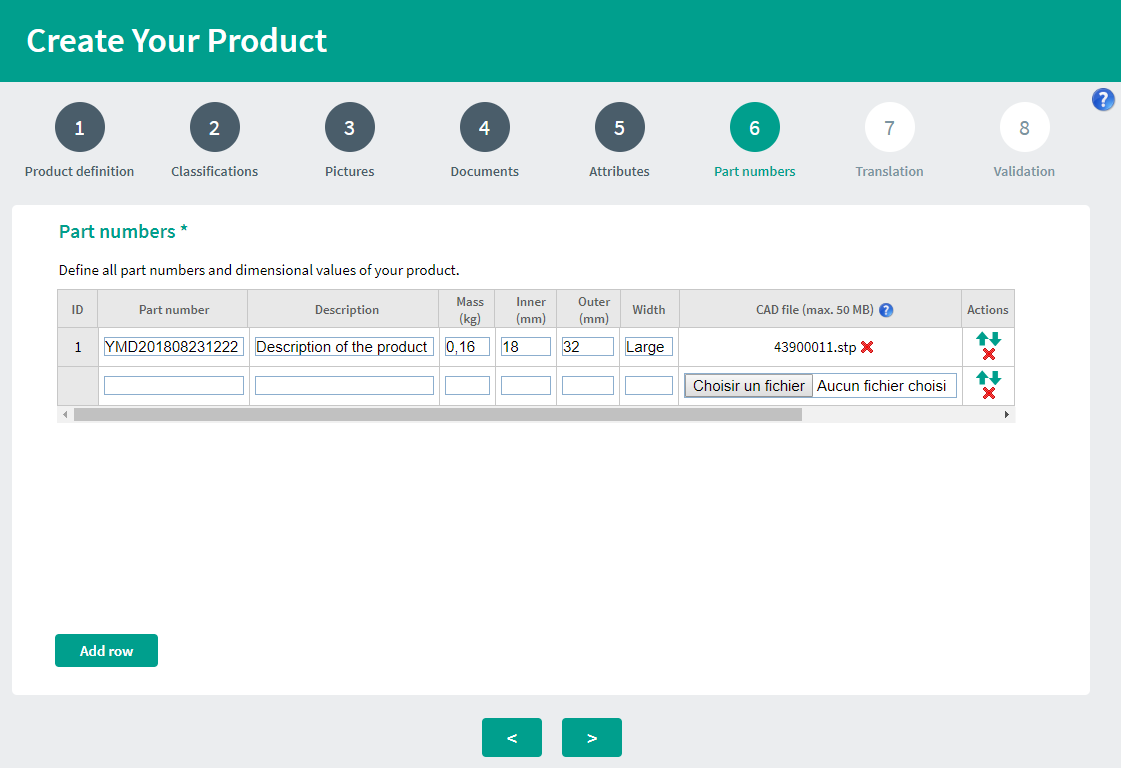 Part numbers Estimated reading: 2 minutes Step 6 - Enter the technical characteristics of your product The configuration of the table header was defined in the previous step. Now the table needs to be completed with the different part numbers of your product. Click on the image to enlarge it. To add a row, click the button “Add row” (below left) or click inside an empty cell to add a row automatically. To move a row, click the “up” and “down” arrows in the “Actions” column or relocate it using your mouse. To delete a row, click the red cross in the “Actions” column. To delete a CAD file, click the red cross next to its name. To import CAD files, click “Choose a CAD file”. (The maximum file size is 50 MB.) The list of supported CAD formats is as follows : STEP Acis IGES Parasolid X-T AutoCAD / Mechanical (Desktop) Drawing 2D exchange SOLDIWORKS Part SOLIDWORKS Assembly Pro/Engineer Part Pro/Engineer Assembly Inventor Part Inventor Assembly CATIA Part CATIA Product Revit Family Rhino3D Model Sketchup STL Termo - Namirial TOPSOLIDOPENPACKAGE 3dsMax Alibre Design assembly Alibre Design part AMF Arc+ Artlantis Autodesk library Altium Cinema 4D Collada EAGLE HiCAD IFC JT KiCAD MiniCAD Design OFF Photometric data Vectorworks Vray VRML Wavefront obj Xshade How do I import a CAD assembly file ? To import a CAD assembly with a main file and sub-files of parts, you need to import it in the form of an archive file (zip, rar, 7z). The name of the archive file must be: the name of the assembly file, with its extension, plus the archive extension.For example, for a zip archive of a SolidWorks assembly: “myassembly.sldasm.zip”. Attributes > Part numbers > Translation