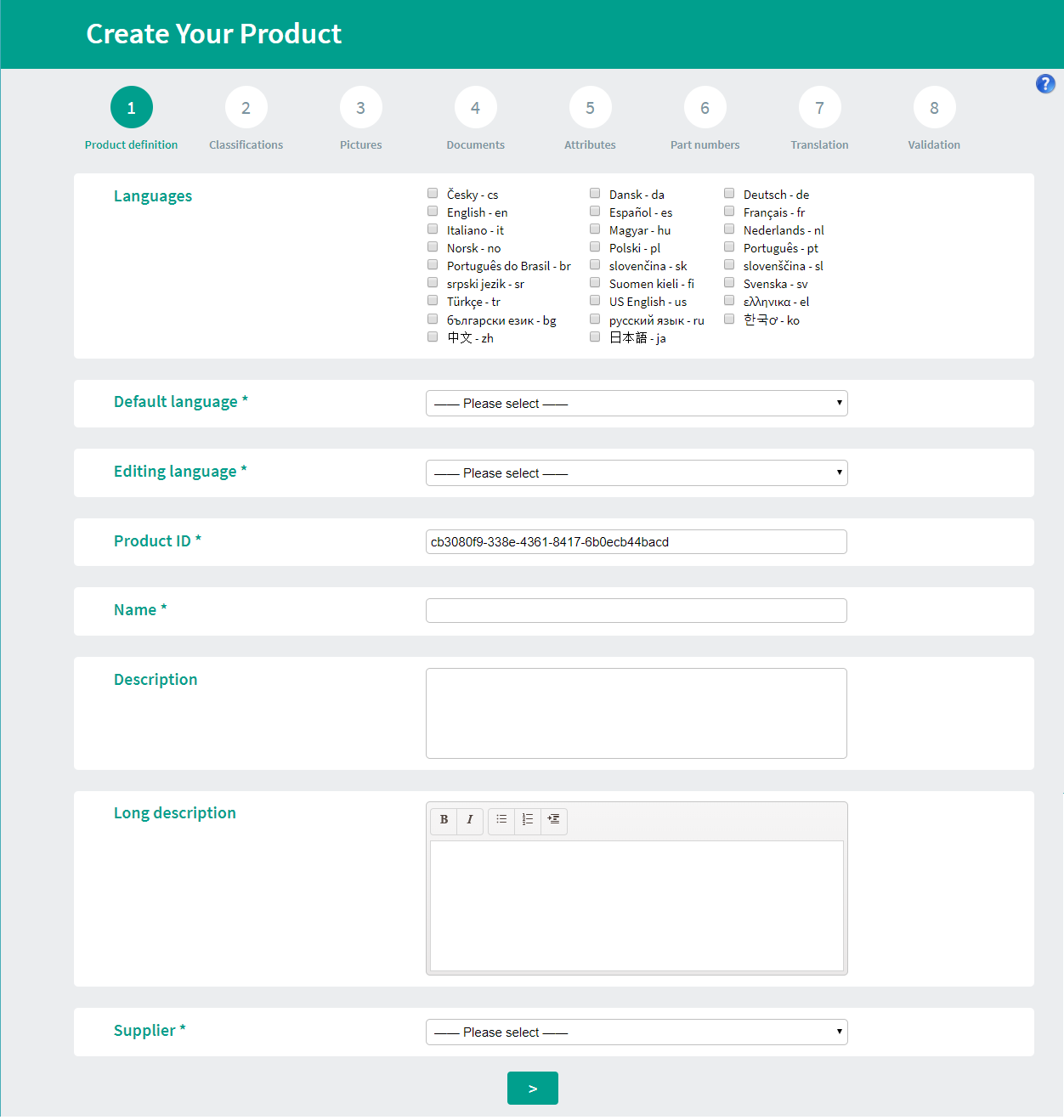 Product definition Estimated reading: 1 minute Step 1 - Define your product Click on the image to enlarge it. Complete the definition data for your product : Tick the language or languages supported by your product. Choose a default language which will replace all languages not supported by your product. Available languages in this list rely on the selected languages in the first step. Define the language that will use to enter product data in the publishing wizard. Available languages in this list rely on the selected languages in the first step. Enter a product ID. This is essential for automating batch updates of your products. As this field cannot be empty, a default product ID is computed. Choose a name for your product. It should be concise and explicit, as people might look your product up via the search engine. Once published, the product appears in the TraceParts Smart-Publishing Dashboard and on traceparts.com. Enter a description, to tell users a bit more about your product. Enter a long description to provide more details and be able to add text formatting features, Select the supplier of your product from the list proposed. Only the fields followed by an asterisk are required. Product Definition > Classification