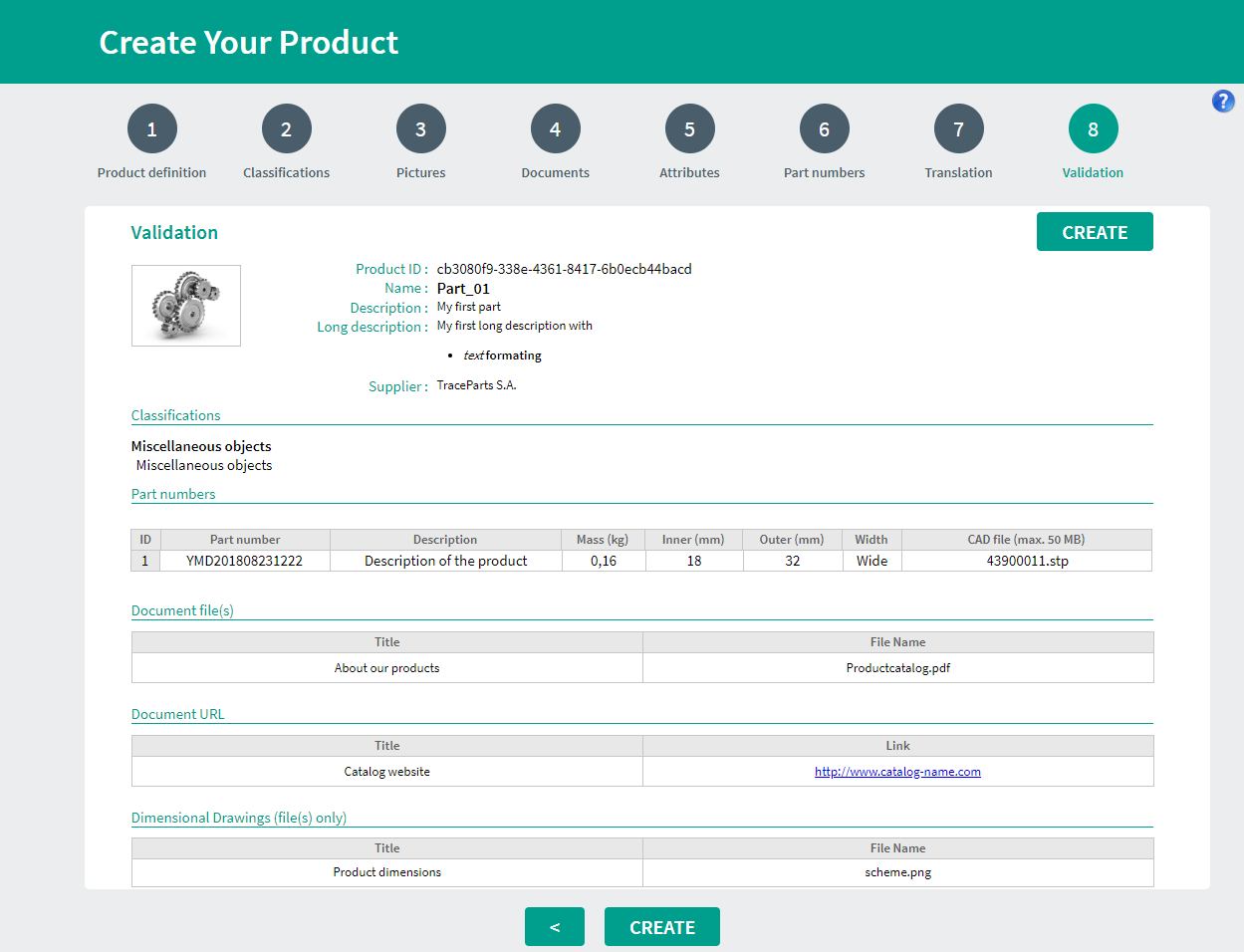 Validation Estimated reading: 1 minute Step 8 – Validate the product before creating it Click on the image to enlarge it. The product definition is now complete. This step allows you to view the information on your product before creating it. If you want to make changes to the product data, click the arrow at the bottom of the page to return to the earlier steps. Click the “Create” button to start the creation process. Before being published, your product undergoes an automatic validation phase. Once validated, the product appears in your dashboard and you can test how it looks before publishing it. Translation > Validation