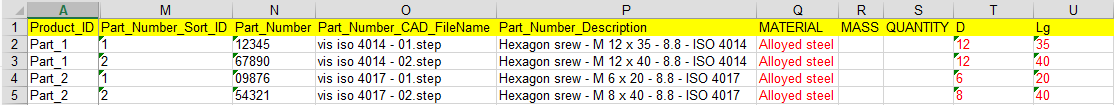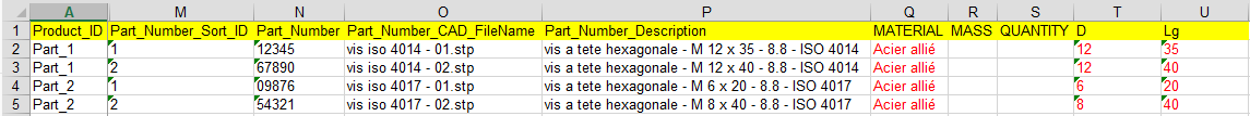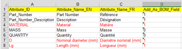 Customizing the template Estimated reading: 6 minutes You can, if you wish, transmit additional information about your products for the people who view your catalog. The information you can transmit concerns the characteristics or “attributes” of your products.An attribute is defined for a product. The values assigned to the attribute will be linked to your part number.Templates are customized in two steps : The first step is to declare an attribute by supplying a definition in the “Attributes_Definition” tab so that the programs that will be processing the file recognize the element and know what to do with it. The second step is to declare the attribute in the “Products_XX” tab so that its values can be assigned. Whatever the attribute type – dimensional or text – the template manages them in the same way. We will see, in the following examples, how to create different attributes. Before going any further, make sure you have fully understood the constraints on attribute identifiers. The first step of the process is to declare attributes in the “Attributes_Definition” tab. Take a screw, for example. Screws are characterized by two main dimensional attributes: diameter and length. We want to add this information for each part number on our screw in the “Products” tab.The “diameter” attribute of the screw is identified as “D”; the “length” attribute is identified as “Lg”.Screws are also characterized by their material attribute, so we also want to add this information for each part number of our screw. We will identify this material attribute as “MAT”. The key difference between the dimensional attributes and this material attribute is that the former have numeric values whereas the latter is a text attribute, and thus translatable. Scroll down the table to the first unused row. By default, if you have not yet added an attribute, the first empty row is row “4”. In the first column, “Attribute_ID”, enter the identifier of the “diameter” attribute: “D”. The following columns, which start with “Attribute_Name”, can be used to assign a name to the attribute. For example, suppose that with the wizard, you selected English and French; you therefore have 2 columns: “Attribute_Name_EN” and “Attribute_Name_FR”.In the column “Attribute_Name_EN” you can specify the English name for the attribute, for example “Diameter D (mm)” (or just “D” if you prefer).In the column “Attribute_Name_FR”, do likewise, but in French: “Diamètre D (mm)” (or just “D” if you prefer. Even if you already entered that for the English label, you have to enter it again for the French label).Remember that it is always advisable to include, in the attribute label, the symbol for the units in which the attribute is measured. Fill the “Add_As_BOM_Field” with “1” to allow the corresponding attribute to displayed to the users Repeat the procedure on the next row with the “length” attribute, identified as “Lg” Repeat the procedure on the next row with the “Screw Material” attribute, identified as “MAT” Important : Do not leave any blank rows in the table between attribute declarations. Example : Click on the image to enlarge it. For the second step of the process, we move on to the “Products_XX” tab. Find the first unused column (where the first row of the column is empty). In the first row of this column, enter “D” – the identifier for the “diameter” attribute. Go to the next unused column. In the first row of this column, enter the identifier for the second attribute, “Lg”. These two new columns will be used to hold the values for the “diameter” attribute and the “length” attribute respectively. Go to the next unused column. In the first row of this column, enter the identifier for the third attribute, “MAT”. This new column will be used to hold the value for the “material” attribute. It only remains for you to complete the table by entering the diameter and the length of your screws against each individual part number. If you have selected more than one language in the wizard (as in our example), copy the attributes and values into each of your Products_XX tabs. Complete the table by entering the material of your screws against each individual part number. In this case, if you have selected more than one language in the wizard, you will need to translate the values of the attribute in each of your Products_XX tabs (see example below). Example (visible data are fictional) : Click on the image to enlarge it. Click on the image to enlarge it. As you progressively customize the file and add more attributes, some of the attributes will not be meaningful for certain products. In this case, in the “Products_XX” tab, leave the cells of these attributes empty for those part numbers to which they do not apply. These attributes will be ignored in the products that do not use them.Conversely, some attributes may be found in several products of completely different types (the “color” attribute, for example). In this case, no need to create a separate attribute for each product: you can use a single unique attribute (identified, for example, as “COLOR”) for all of the products.Finally, bear in mind that you cannot have 2 identical identifiers in the same “Products_xx” tab. So if, for the previous example, we had used a bearing rather than a screw, we might have declared 2 diameter attributes, one for the internal diameter, and one for the external diameter.If we had done so, we couldn’t have identified them as “D” and “d”. The programs would assume they were dealing with the same identifier, as they don’t distinguish between upper and lower case. The two attribute identifiers must therefore be distinct. For example, you might use “DIA_EXT” and “DIA_INT”.There is no such concern when it comes to the attribute names: they can take the values “D” and “d