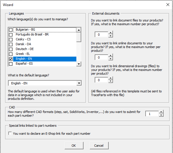 Startup : using the wizard Estimated reading: 3 minutes The template file contains a small macro, designed to build the file structure that corresponds to your needs. To do so, it calls up a dialog box containing a number of questions for you to answer. Double-click the file to open it in Microsoft Excel. If an alert message appears about the macro, click the “Enable macros” button. Click the “Create the structure” button to run the macro. The following dialog box appears on the screen. (If not, it may be because you disabled the macros, in which case see MS Excel Help on how to re-enable macros.) If you have clicked “Erstelle die Struktur” or “Créer la structure”, the dialog box will be displayed either in German or French. Click on the image to enlarge it. Languages section From the list, select the languages for which you want to supply data.– You must select at least one language.– You may select more than one.– The language code for each selected language will be marked in the “System” tab next to an attribute called “Selected_Language_Code”.Depending on the number of languages you select, a certain number of tabs will be created.You will have a tab or tabs named “Products”, with an added suffix consisting of a separator followed by a language code. Example of Products tab names in French and English:– Products_FR (for French)– Products_EN (for English)Next, in the pull-down menu underneath the list, you need to select the “default language”– This is required information.– The list of languages available in the pull-down menu depends directly on which languages were selected earlier.– The language code that corresponds to your selection will be marked in the attribute “Default_Language_Code” in the “System” tab. External documents section If you have documents that relate to your products, such as assembly instructions, online documents or dimensional drawings, you can declare them in the template file.Start by specifying the maximum number of documents that you want to associate with your products.We offer two ways of managing these documents:– You can send us your documents, and we will host them on our server.– If your documents are already publicly accessible on your own server, simply send us the URL for each of the documents you want to reference.Depending on the answers to these questions, certain fields will be created in the “Products_xx” tab (“xx” corresponds to the code for the selected language):– Document files: “Product_Document_FileName_y” and “Product_Document_Title_y” (y from 1 to 20)– Online documents: “Product_Document_URL_y” and “Product_Document_URL_Title_y” (y from 1 to 20)– Dimensional drawings: “Product_Dimensional_Drawing_FileName_y” and “Product_Dimensional_Drawing_Title_y” (y from 1 to 20)If you answer “0” for a question, the related fields will not be created.The answer you give will be marked in the “System” tab:– “Product_Document_Number” for documents files– “Product_URL_Number” for online documents– “Product_Dimensional_Drawing_Number” for dimensional drawings– “Part_Number_EShop_URL” for E-shop linkOnce you have answered all the questions, click “OK”.The macro then creates tabs containing various fields.Once the file structure has been generated, the macro cannot be used again. Using the template > Startup : using the wizard > File structure