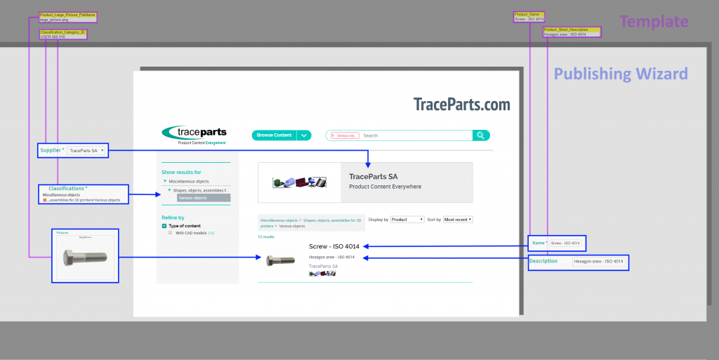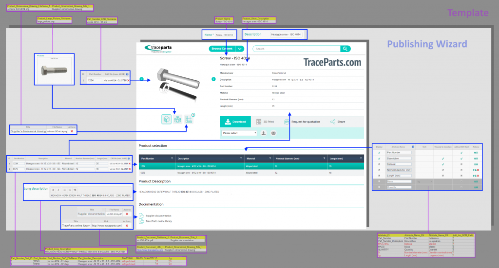 Where will the data be displayed on the site ? Estimated reading: 1 minute Here's where the data will be displayed on traceparts.com Product block Picture below shows how data from the template and the wizard are used to build and display the product block in traceparts.com. Click on the image to enlarge it. Product sheet Picture below shows how data from the template and the wizard are used to build and display the product sheet in traceparts.com. Click on the image to enlarge it. Customizing the template > Where will the data be displayed on the site ? > Uploading the product data file